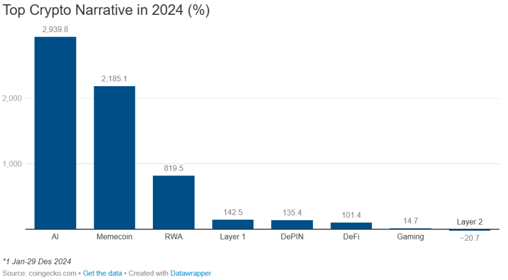 Narasi memecoin mencatat rekor kenaikan hingga 3.211,4% pada Desember, meskipun sifatnya sangat volatil. Popularitas token berbasis meme internet ini melonjak di awal tahun, menarik perhatian investor dari berbagai kalangan. Sayangnya, minat terhadap memecoin mulai menyusut di akhir tahun, sehingga memicu koreksi harga.