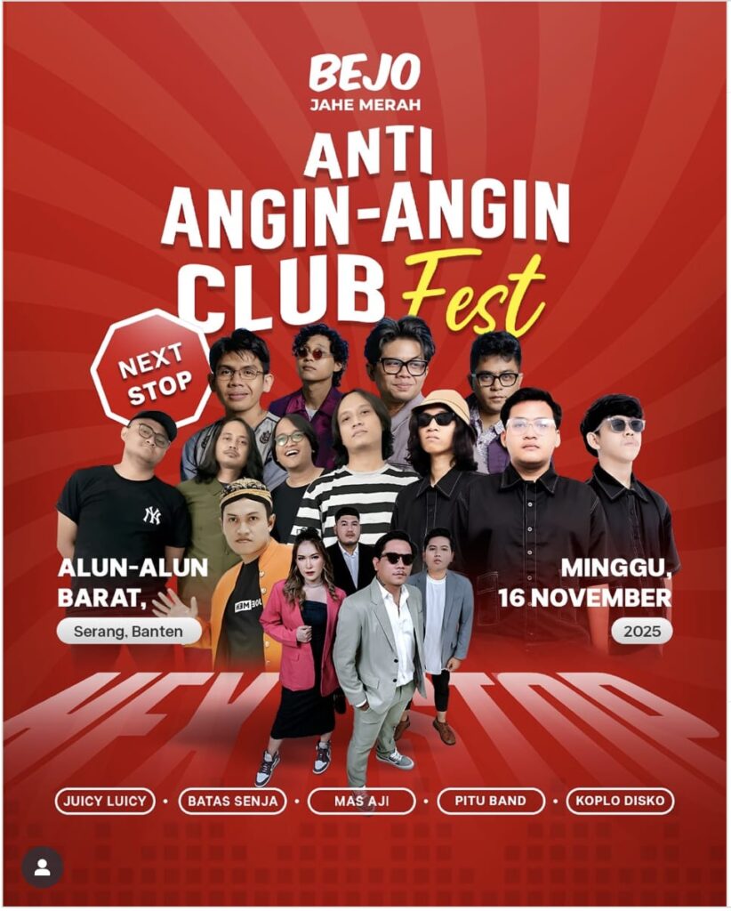 GELUMPAI.ID – Usai sukses mengguncang Metro, Lampung, pada akhir Oktober lalu, Anti Angin Angin Club Fest kini bersiap menyapa warga Serang, Banten, dengan energi musik dan kehangatan jahe merah.
