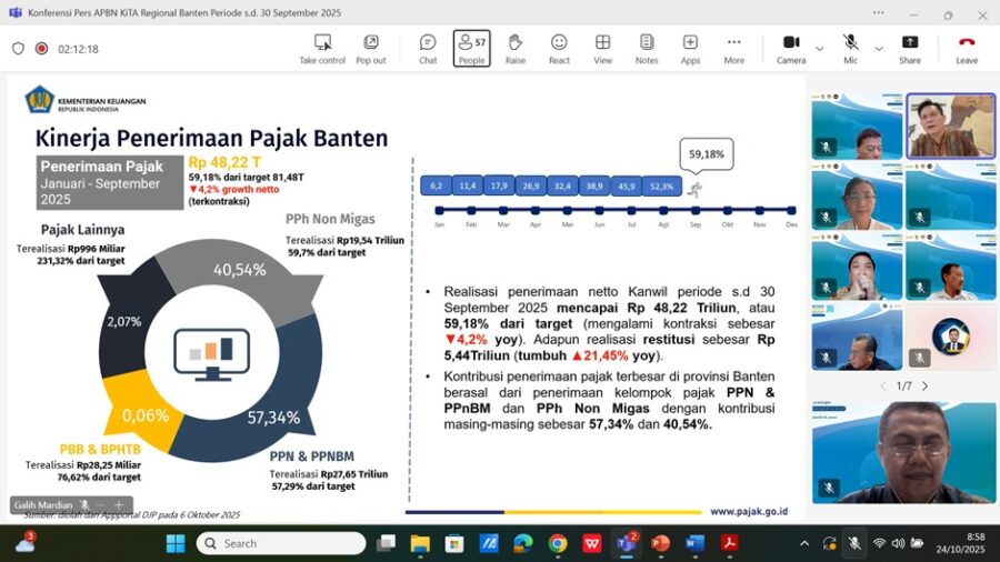 Kepala Bidang Data dan Pengawasan Potensi Perpajakan Kanwil DJP Banten, Muhamad Riza Pahlevi, menyampaikan bahwa hingga September 2025, penerimaan pajak tercatat sebesar Rp48,22 triliun atau 59,18 persen dari target APBN sebesar Rp81,48 triliun.