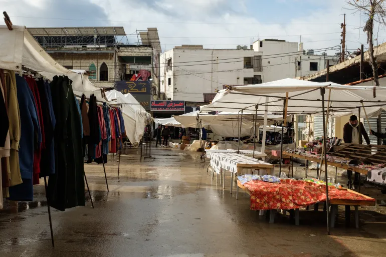 Pedagang seperti Jihad Abdallah tetap bertahan. Ia menjual pakaian olahraga di tengah puing-puing.