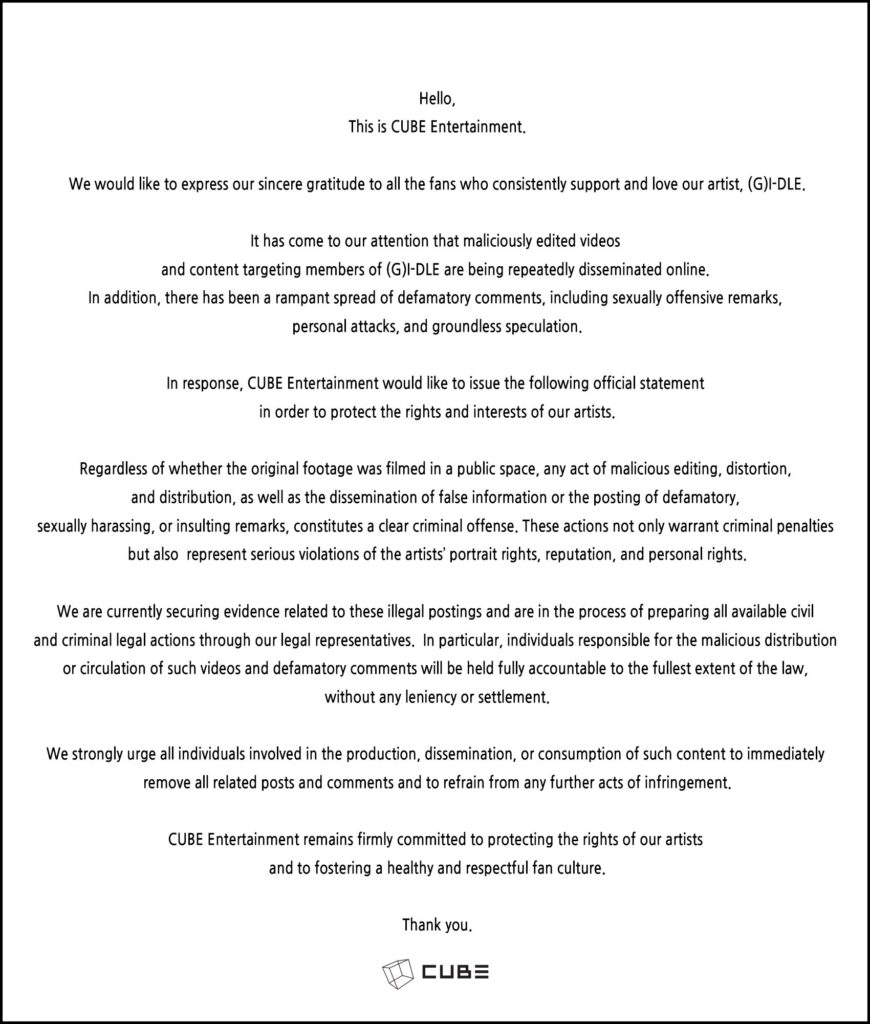“Untuk melindungi hak dan reputasi artis kami, kami sedang mengambil langkah hukum terhadap tindakan pencemaran nama baik seperti penyebaran informasi palsu dan video yang diedit dengan niat jahat,” tulis CUBE.