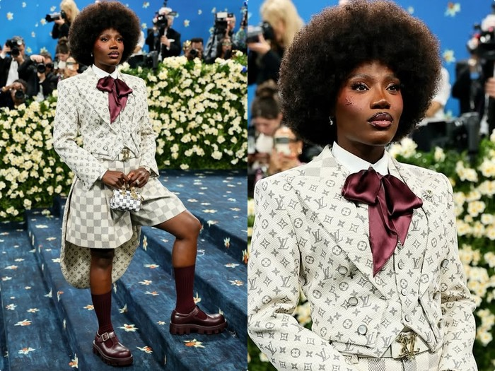 Dari panggung hip hop, Doechii tampil berani dalam setelan putih-abu rancangan Louis Vuitton. Siluet tajamnya memancarkan energi kuat, ditambah rambut afro besar dan makeup dengan logo LV di pipi.