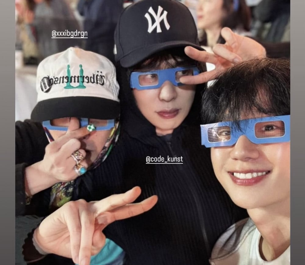 Dikutip dari All Kpop, foto tersebut menampilkan G-Dragon berpose bersama produser Code Kunst dan aktor Jung Hae In. Ketiganya terlihat kompak dengan kacamata kotak biru yang matching.