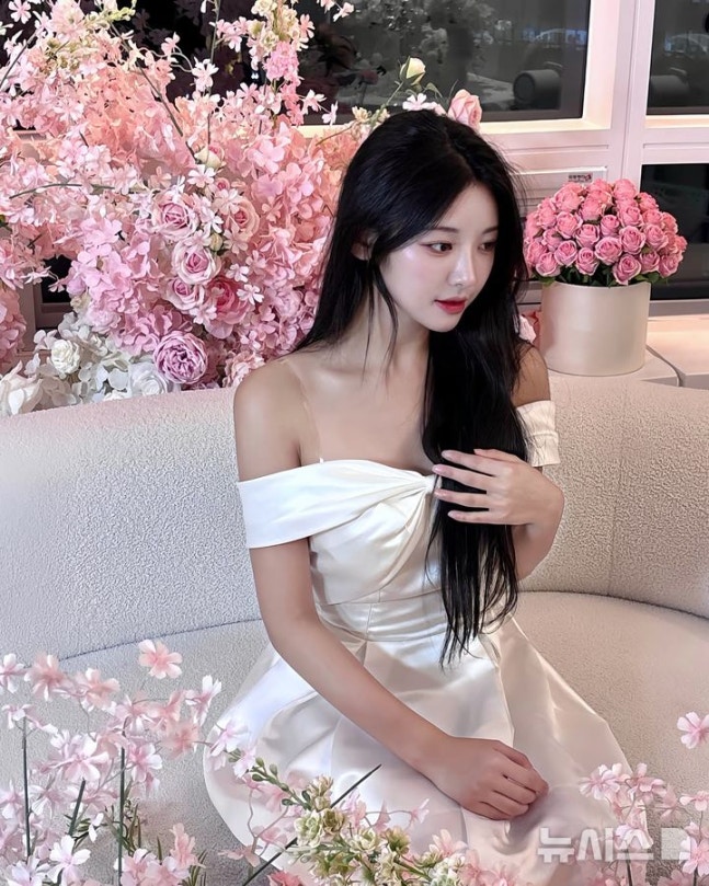 Aura feminin makin terasa dengan dekorasi bunga berwarna pink di sekitarnya, menambah kesan romantis sekaligus membuatnya tampak seperti pengantin yang sedang berpose di hari bahagia.