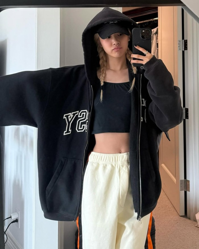 Ia memadukan jaket oversized warna hitam dengan crop top minimalis, celana jogger putih, dan topi hitam.