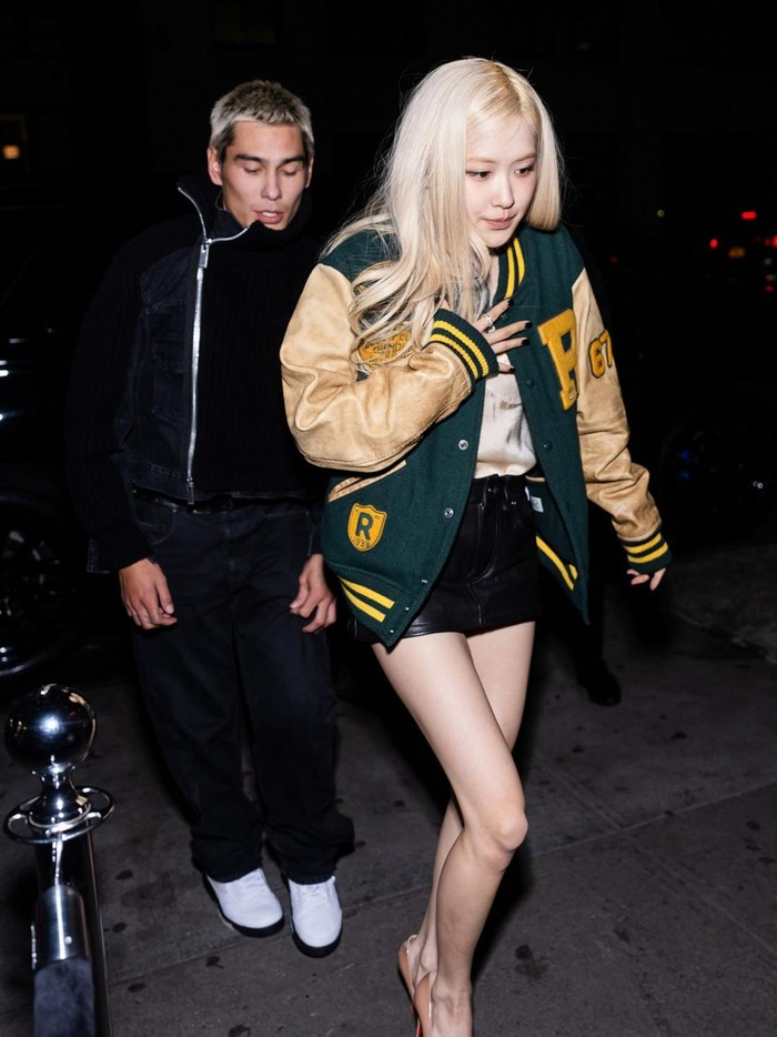 Tak hanya retro, Rosé juga memadukan jaket vintage sporty dengan atasan satin dan celana pendek kulit.