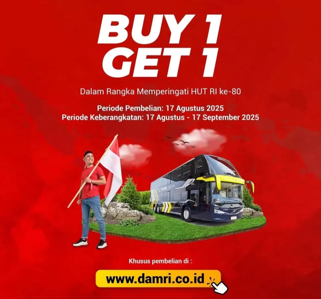 GELUMPAI.ID – Menyambut Hari Ulang Tahun ke-80 Kemerdekaan Republik Indonesia, DAMRI menghadirkan promo spesial yang sayang dilewatkan, Buy 1 Get 1, alias beli satu tiket, gratis satu tiket.