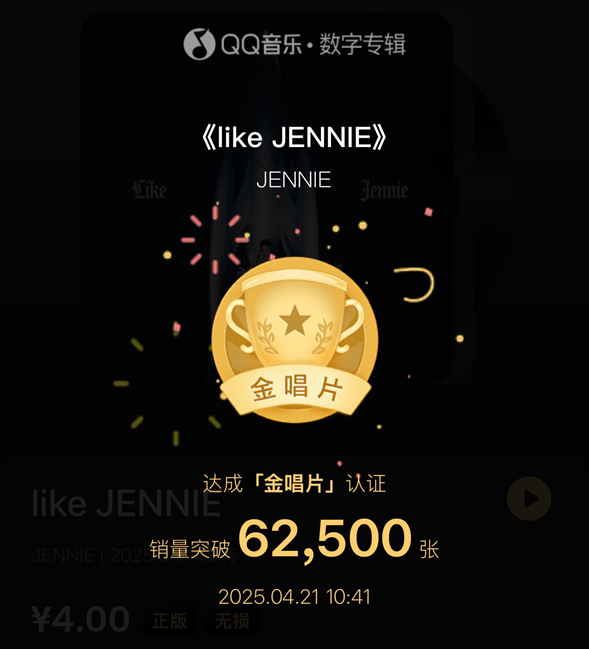 Pencapaian ini datang beberapa minggu setelah album solonya “Ruby” menembus 400.000 penjualan digital di negara tersebut. Jennie pun mencatat sejarah sebagai artis pertama di 2025 yang berhasil menjual album dan single masing-masing lebih dari 100.000 kopi digital di China.
