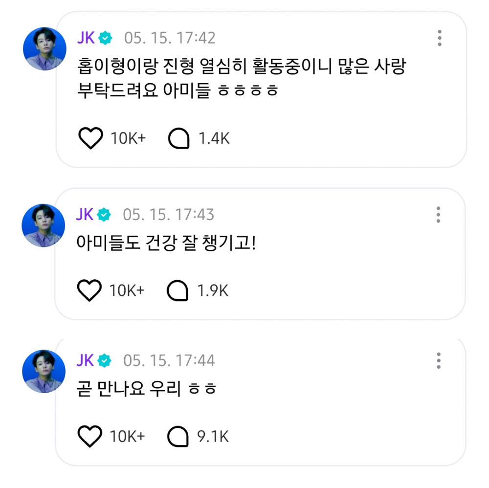 Pada 15 Mei, Jungkook menulis di Weverse, “Lagi ngapain?” Ia juga membalas banyak komentar penggemar dengan gaya santai khasnya.