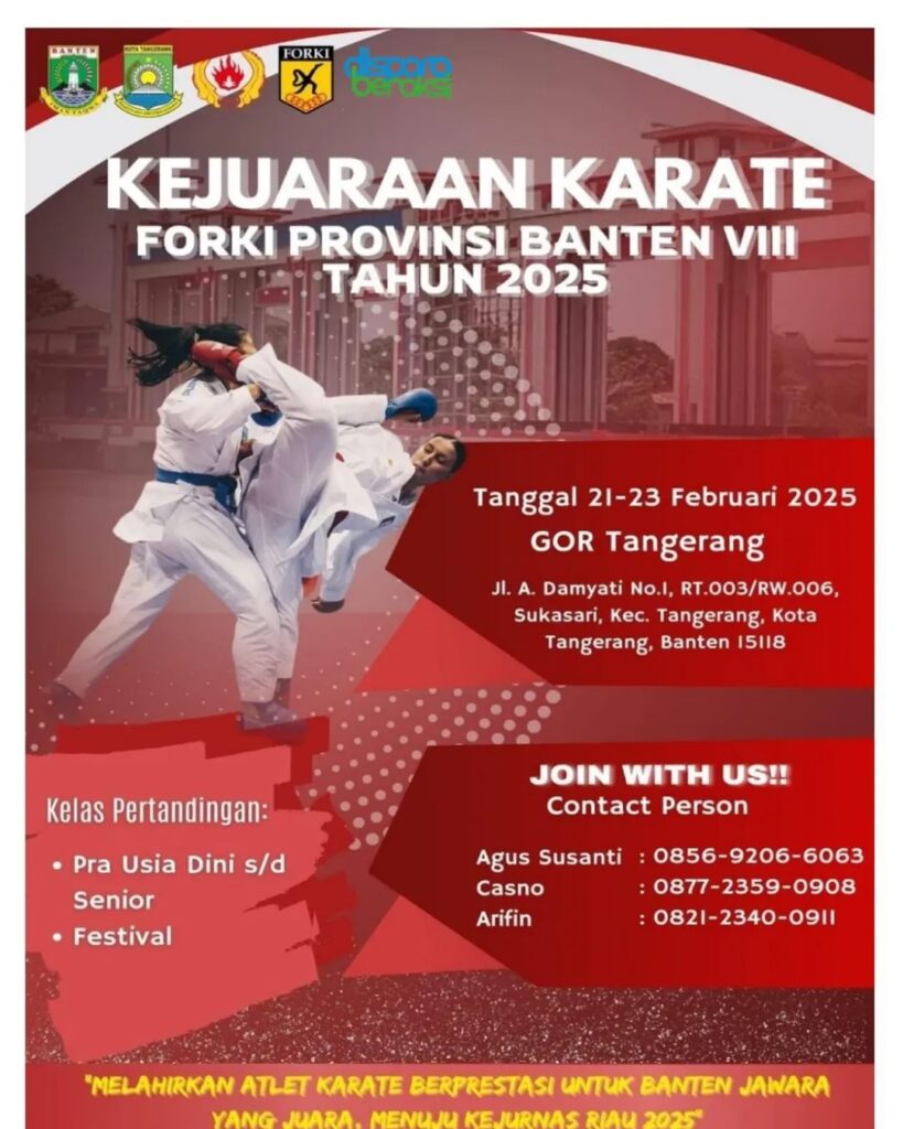 Kejuaraan Karate FORKI Provinsi Banten VIII akan dilaksanakan di GOR Tangerang pada 21 hingga 23 Februari 2025.