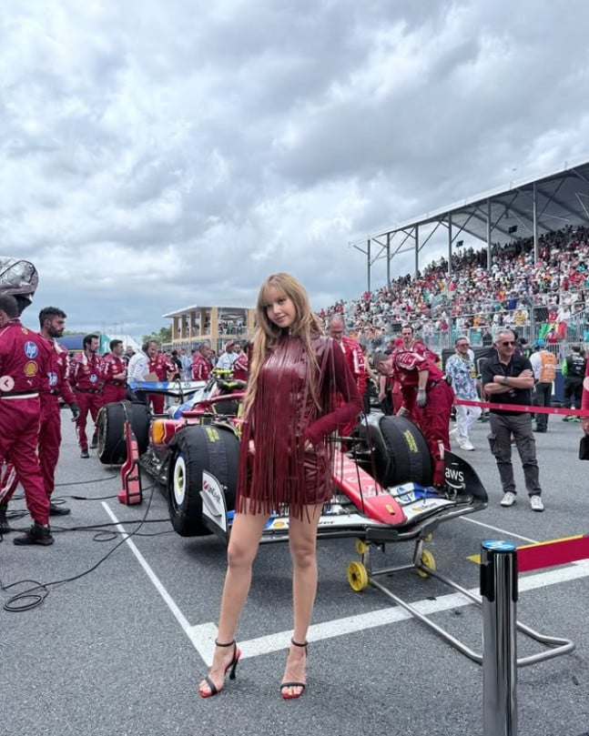 Dalam foto yang dibagikan, Lisa terlihat percaya diri berpose di depan pit stop tim Scuderia Ferrari. Ia juga sempat berpose di samping mobil balap mewah.