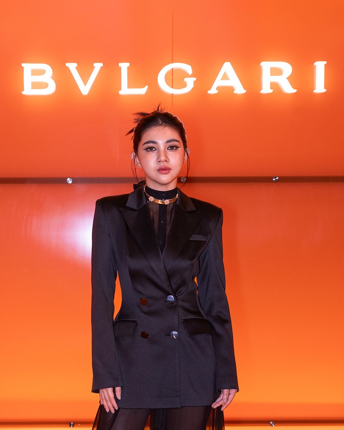 Choker emas dari koleksi Serpenti menjadi highlight yang membuat tampilannya semakin berkelas dan sophisticated.