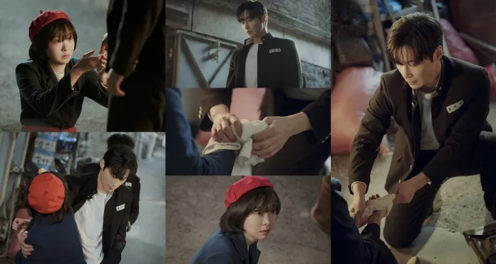 Aksi itu berlanjut dengan adegan yang bikin jantung penonton berdegup lebih kencang: suara berat Jae-pil bertanya, “Kamu tidak apa-apa?”, lalu dengan penuh perhatian membalut tangan Young-rye yang terluka.