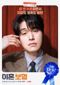 Kang Han Deul (Lee Joo Bin), di sisi lain, merupakan seorang “pemula dalam perceraian” yang poster karakternya langsung mencuri perhatian. Senyumnya yang penuh percaya diri memberi kesan kegilaan yang halus, dengan keterangan yang menyebutkan bahwa dia telah “memutuskan untuk beralih dari bersabar sepenuhnya menjadi tidak terkendali.” Sebagai seorang penjamin, Kang Han Deul bergabung dengan tim asuransi perceraian, menciptakan dinamika yang unik bersama Noh Ki Jun.
