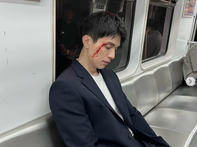 Dalam foto, Lee Dong-wook terlihat duduk di dalam kereta bawah tanah dengan wajah penuh luka lebam merah dari alis hingga pipi, sementara kedua lengannya berlumuran darah.