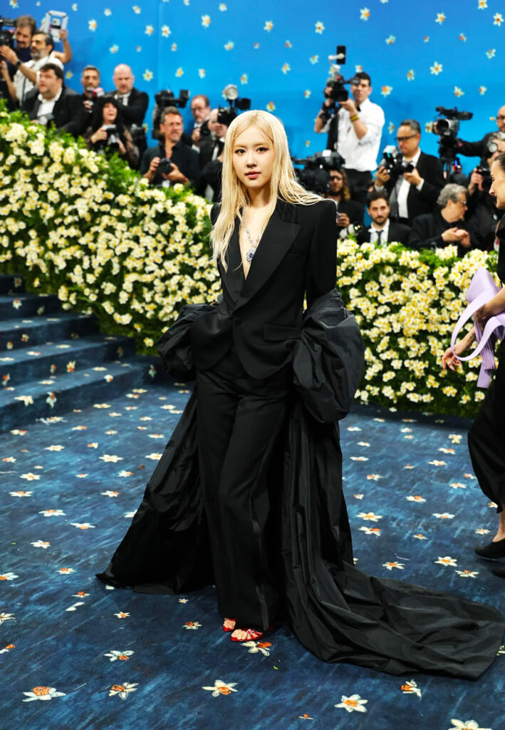 Dikutip dari Kaltim Post, Rosé memilih tuxedo hitam Saint Laurent. Sepatu hak merah menjadi aksen mencolok.