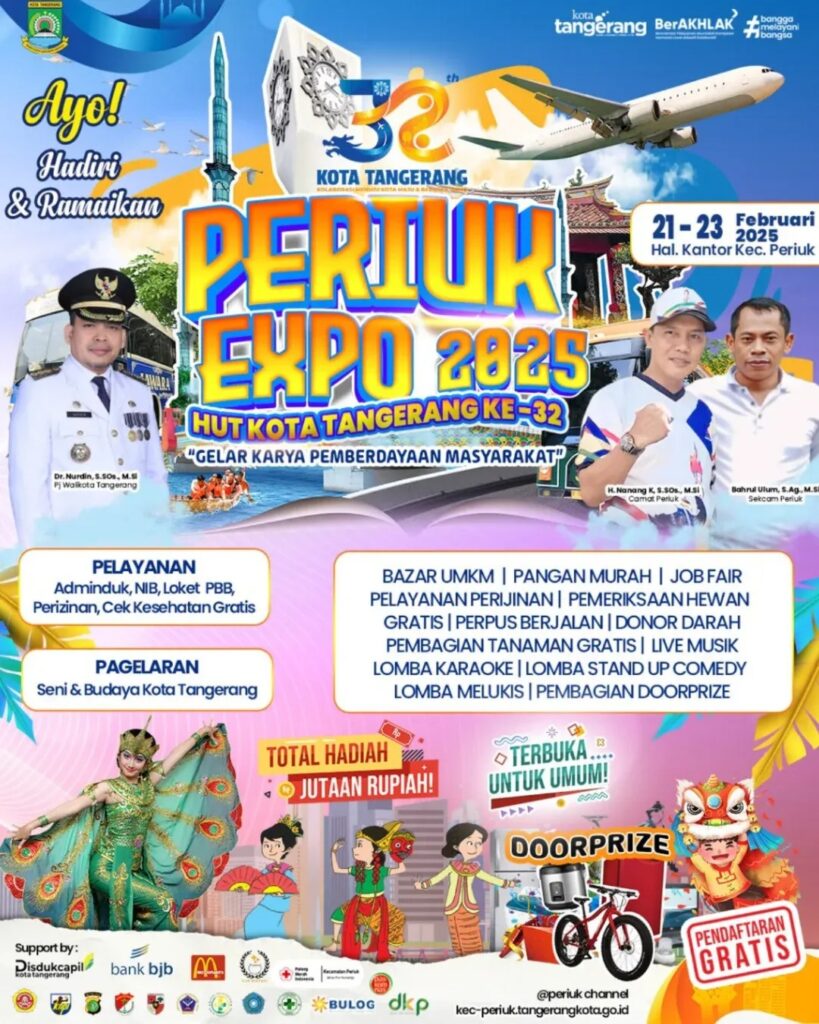 GELUMPAI.ID – Sebagai rangkaian menyambut Hari Ulang Tahun (HUT) ke-32 Kota Tangerang, Kecamatan Periuk akan menggelar Periuk Expo 2025 yang akan digelar pada 22 Februari 2025 hingga 23 Februari 2025.