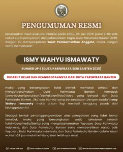 Tim GELUMPAI.ID mendapatkan salinan surat pemberhentian yang dikeluarkan pada 11 Juli 2025 oleh Yayasan Abhiyya Parama Mavendra, lembaga yang membawahi Duta Pariwisata Banten.
