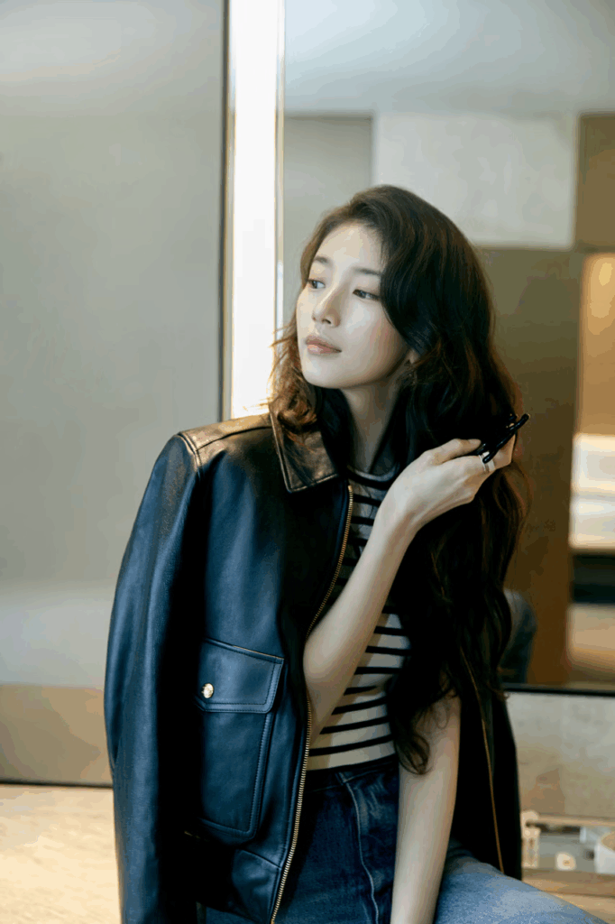 Dikutip dari BAZAAR, Suzy memilih busana sederhana namun stylish. Dia mengenakan sweater marinière tanpa lengan dan jeans flare. Jaket Aviator kulit domba hitam menambah kesan chic.