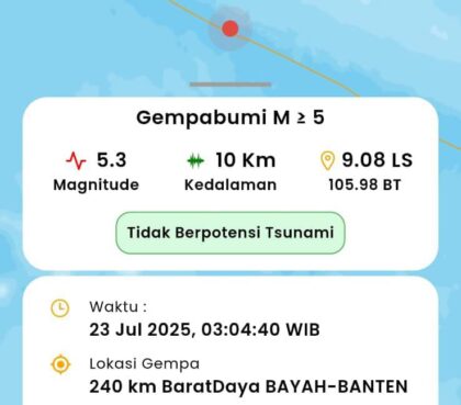 News News Gempa 5,3 SR Guncang Laut Selatan Banten, Tak Berpotensi Tsunami Juli 23, 2025 • GELUMPAI.ID – Guncangan bumi kembali terasa di wilayah selatan Banten pada Rabu dini hari, 23...