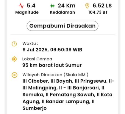 News News Gempa Magnitudo 5,4 Guncang Barat Laut Sumur, Terasa hingga Bandar Lampung Juli 9, 2025 • GELUMPAI.ID – Badan Meteorologi, Klimatologi, dan Geofisika (BMKG) melaporkan kejadian gempa bumi yang terasa di...