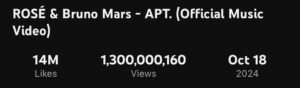 GELUMPAI.ID – Pada tanggal 13 Maret sekitar pukul 10:43 malam KST, video musik untuk “APT.” berhasil mencapai lebih dari 1,3 miliar penayangan di YouTube.