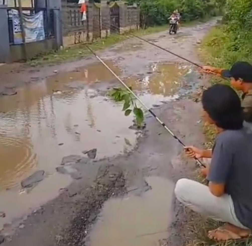 Sejumlah warga memilih melakukan aksi unik dengan memancing di ruas jalan yang sudah lama rusak dan tergenang air.